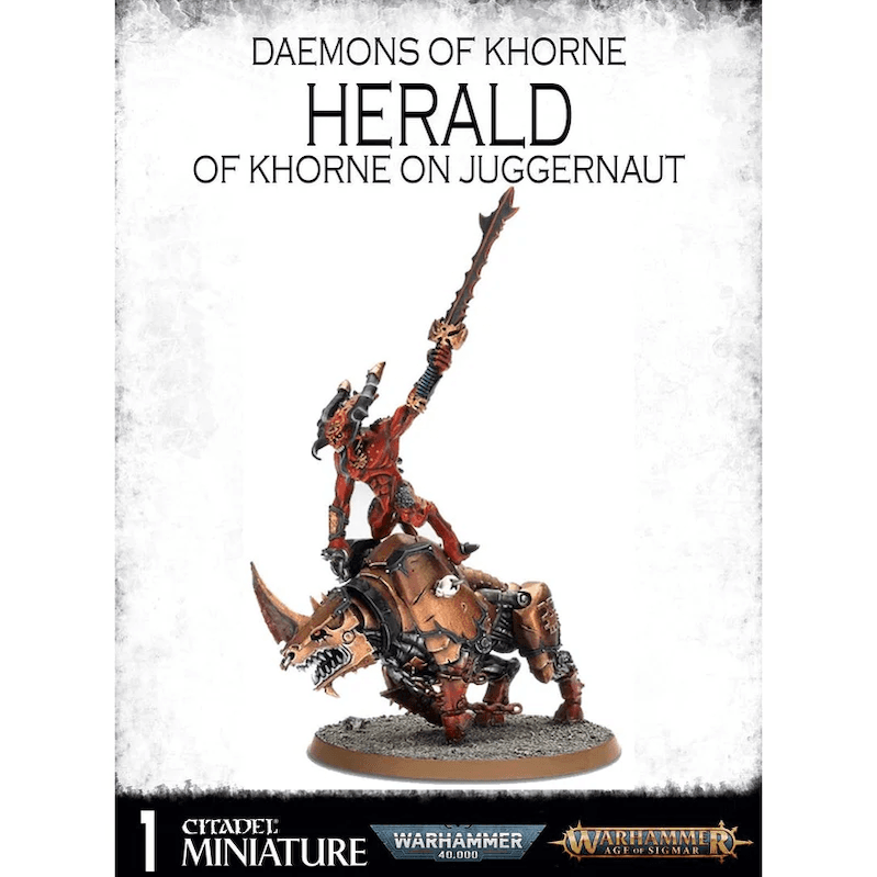 This is a finely detailed resin cast kit, and contains seventeen components, a 50 x 75mm square base and a 60mm round base with which to make one Herald of Khorne on Juggernaut of Khorne.