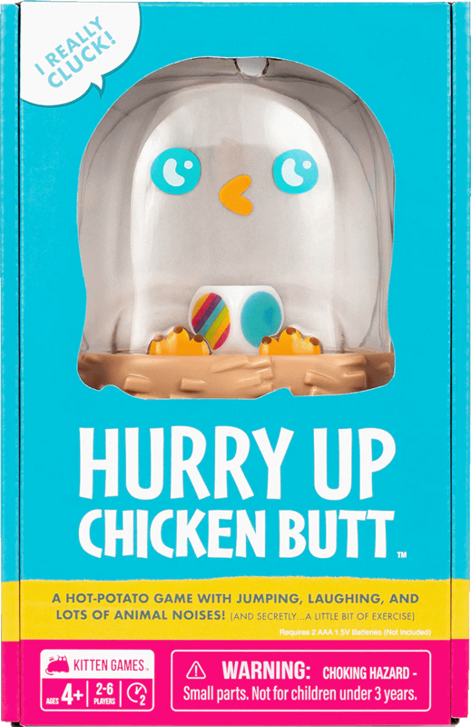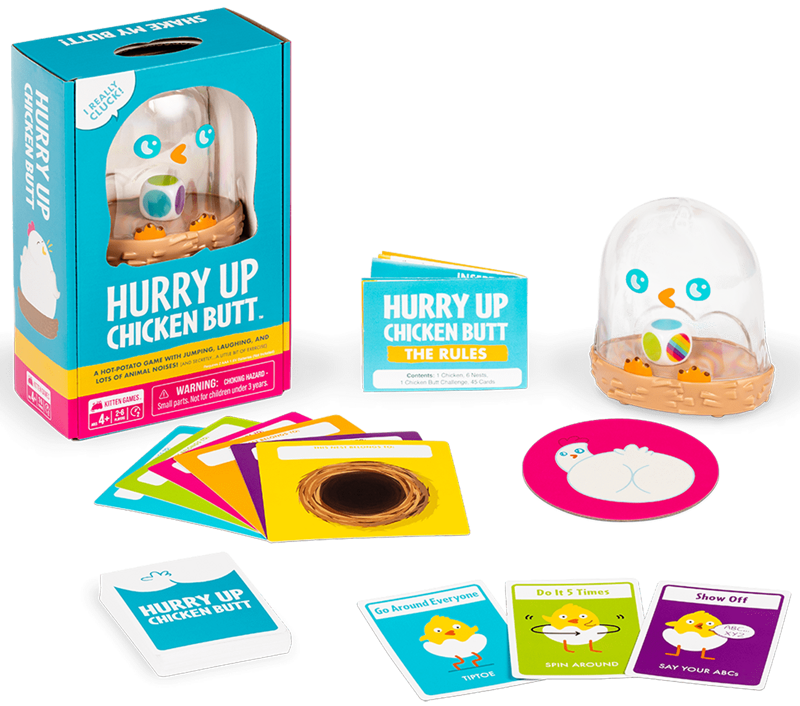 Hurry Up Chicken Butt is akin to a game of “hot potato”, but with a chicken-shaped shaker that clucks and holds the dice, with players needing to complete silly challenges in order to pass the chicken.