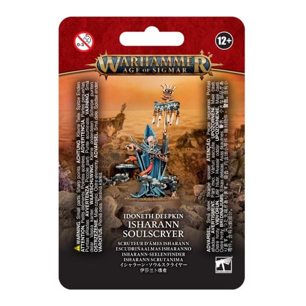 This multi-part plastic kit contains the components necessary to assemble an Isharann Soulscryer. Clad in ornate robes, with a large collar and headpiece that make his priestly origins and role clear, he is a purposeful-looking miniature. His robes are held together by a large set of metal shoulder pads, which also protect his back, curving up into 2 points covered in carved Idoneth symbols. His head is shaved and his ears pierced – adding to the personal decorations are bands of metal on his arms. With him he carries a cyfar compass, a large bowl-shaped item attached to his cloak, and his dowerchimes; these hang from a large pole held in his left arm, and extend far above him, ending in an ornate Idoneth rune. 9 Scryfish swarm around his legs, following the direction his clawed right hand points.