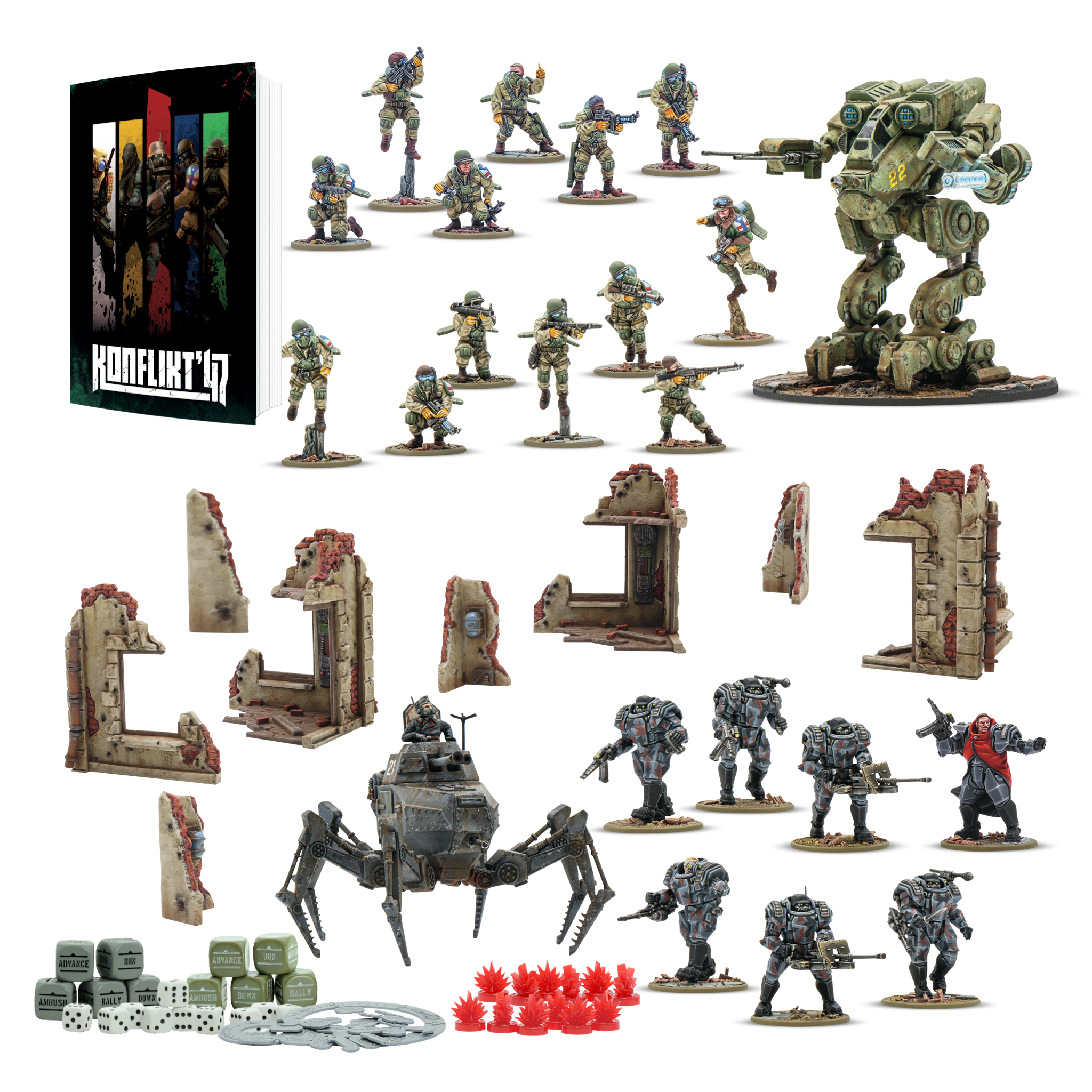 This starter set contains everything you need to start playing Konflikt ’47 – rulebook, models, dice, scenery, and more. Elite United States Firefly jump infantry, supported by the armoured punch of a Linebacker walker, drop from the skies into combat against hulking Axis Stahltruppen heavy infantry and a scuttling Vogelspinne light mech – the perfect introduction to the lethal battlefields of Konflikt ’47 and the foundation of a pair of powerful forces. In addition, each force is led by a powerful hero figure, unique to this set!