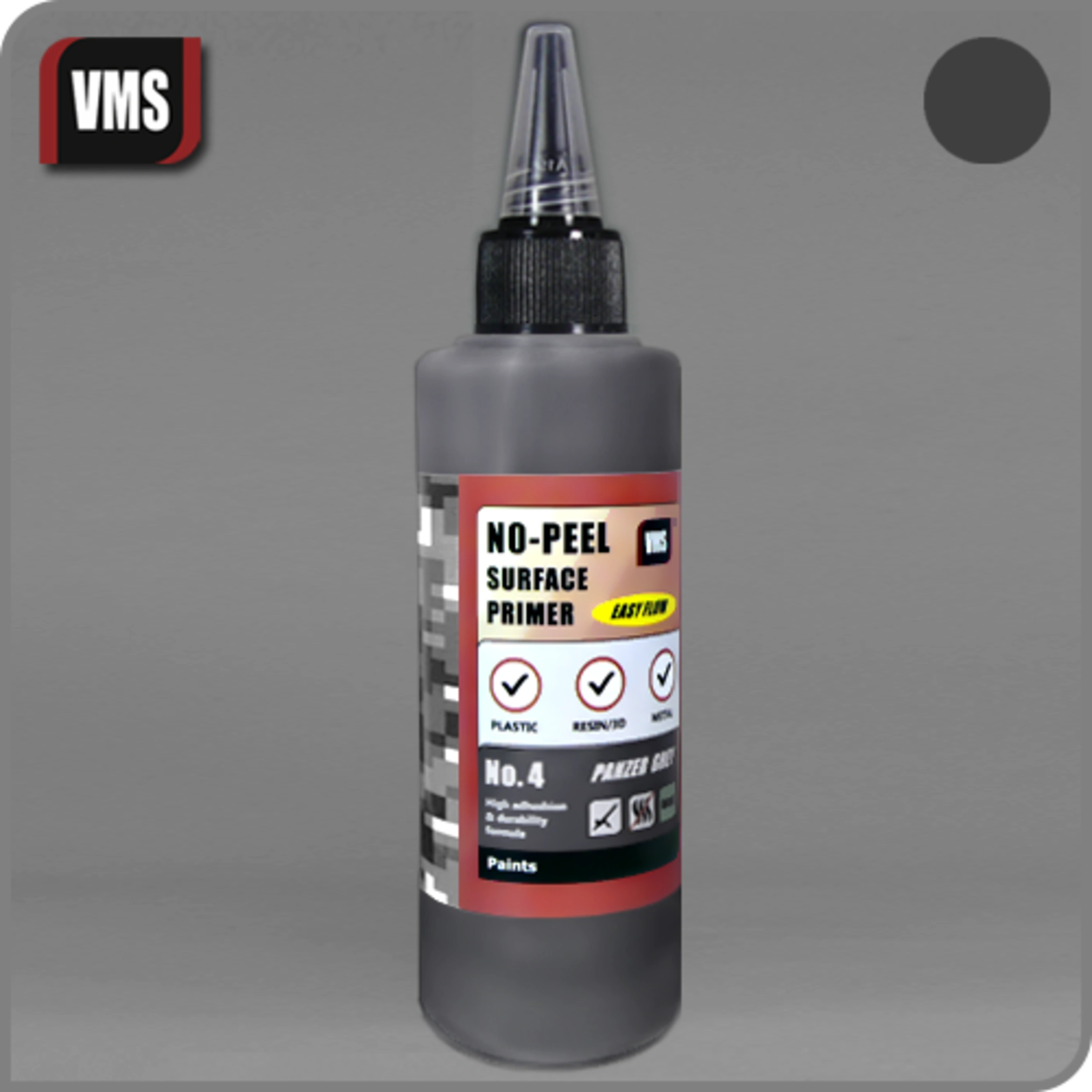 VMS No-Peel primer is a high performance primer combining adhesion and durability levels of solvent-based primers and working ease of water-based products. Simply put, an odourless, sure-fire primer that will adhere to any surface and not peel away like generic acrylic and acrylic polyurethane primers. Suited to prime plastic, metal, resin and 3D printed parts to give your paints an adhesion and durability boost. Thinned for airbrushing and self leveling, with viscosity of only 40 cSt. (DIN 53 211) allowing you to use a 0.2 nozzle for maximum control. You can readily pre-shade using VMS black and white primers, conserving your paints. Product doesn’t flood details which will remain crispy thanks to the small particle size binder used. No aggressive solvents content means VMS No-Peel primer can be applied over styrofoam and other delicate materials and as an added bonus there will be no noxious fumes in your workplace. Tools can be cleaned with tap water conserving airbrush cleaner. Paint can be applied after just 2 h of natural drying or as soon after 30 minutes following force-drying. Comes in a handy 100 ml dropper bottle. Working PSI: 20-40. Recommended nozzle sizes 0.2, 0.3, 0.4. IMPORTANT: The acrylic product is susceptible to low temperatures and mustn’t be frozen! Store and handle in room temperature.